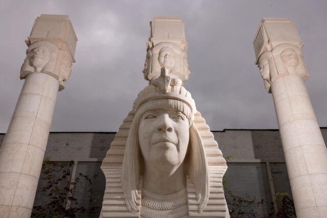Il parco di sculture della “sorella sognatrice” di Lauren Halsey nel sud di Los Angeles contiene sfingi e rilievi scolpiti accanto a colonne hatoriche in stile egiziano con i volti dei mentori e dei membri della famiglia di Halsey.