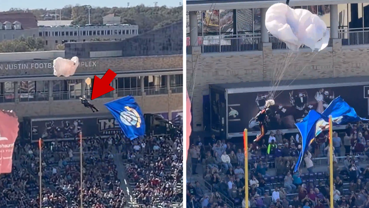 Il momento selvaggio è avvenuto prima della partita di soccer del faculty a Fort Value, in Texas, venerdì… quando alcuni paracadutisti sono saltati dagli aerei durante il cavalcavia per atterrare sul campo – tutto abbastanza normal per incontri di grande successo come questo.