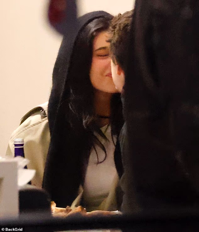 Jenner e Chalamet si sono infilati in una torta di peperoni e hanno sorseggiato bibite mentre erano seduti al bancone di un locale informale in bianco e rosso a tema italiano, prima di baciarsi.
