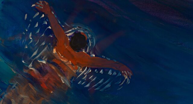 L’opera di memoria dipinta a olio di Florence Miailhe racconta di Alfred Nakache, un nuotatore francese di origine ebrea algerina che finì davanti ai concorrenti nazisti alle Olimpiadi di Berlino del 1936, si unì alla Resistenza e sopravvisse advert Auschwitz.