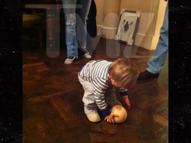 Sembra che il ragazzo stia giocando con la palla sul seno mentre Andrew striscia su un tappeto di fronte a lui in molti degli scatti. Una foto successiva li mostra seduti insieme su un divano.