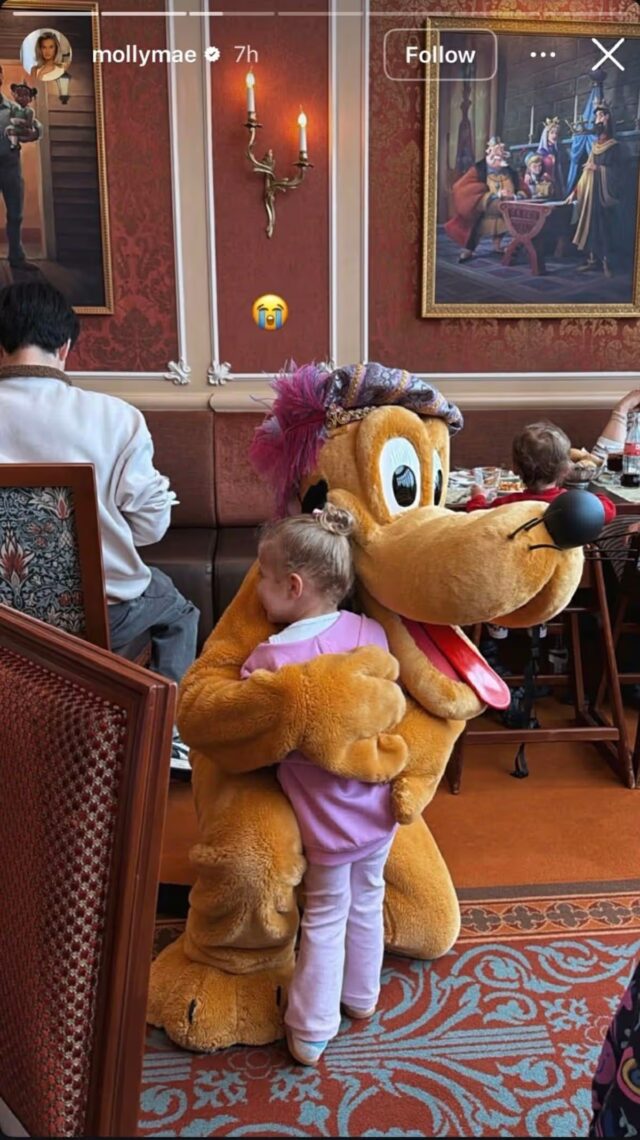 Una volta atterrata in Francia, Molly-Mae ha pubblicato una foto dell’iconico castello della Bella Addormentata e ha scritto: “L’ultima volta come una famiglia di 3 persone”, insieme a una serie di emoji piangenti. Ha continuato a pubblicare un adorabile video di Bambi, che indossa un abito della Principessa Belle, mentre è seduta sulle spalle del suo papà boxer.