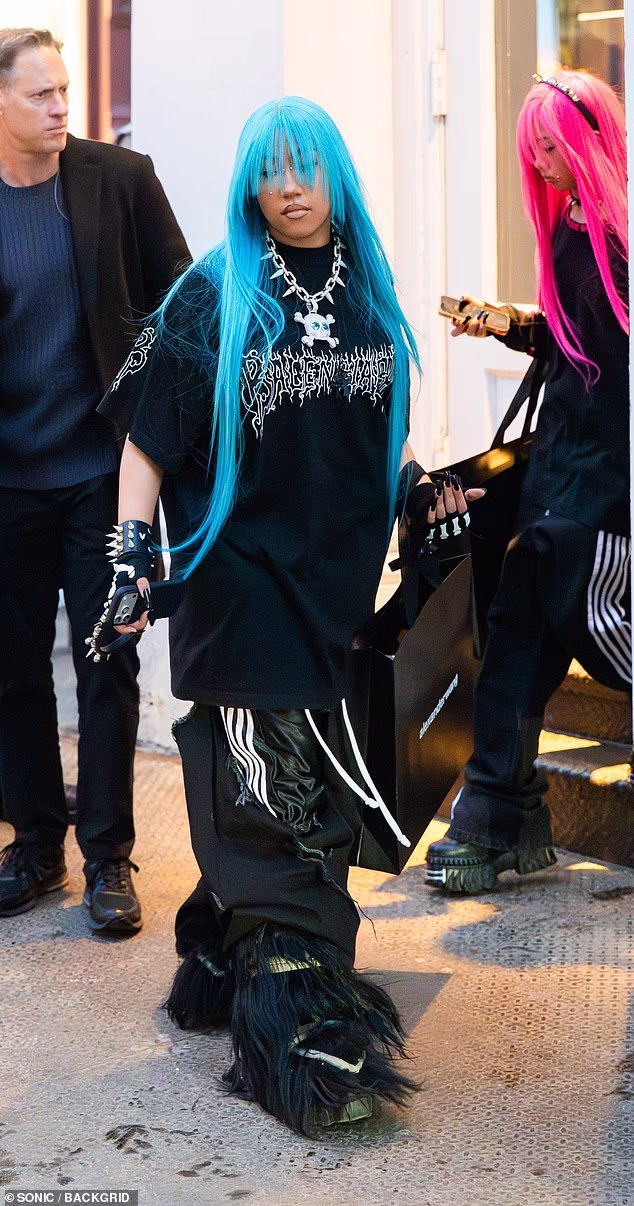 North sfoggiava lunghi capelli blu neon con una frangia a strati che le copriva gli occhi, ed è stata raggiunta da amici con capelli al neon abbinati