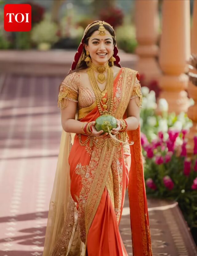 Rashmika, vestita con un rustico sari arancione e oro Anamika Khannaindossava antichi gioielli in oro con finitura opaca radicati nel linguaggio del design dell’India meridionale.