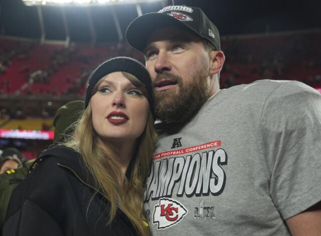 Travis Kelce e Taylor Swift festeggiano la vittoria dei Chiefs sui Buffalo Payments nel campionato AFC il 26 gennaio 2025 a Kansas Metropolis, Missouri.