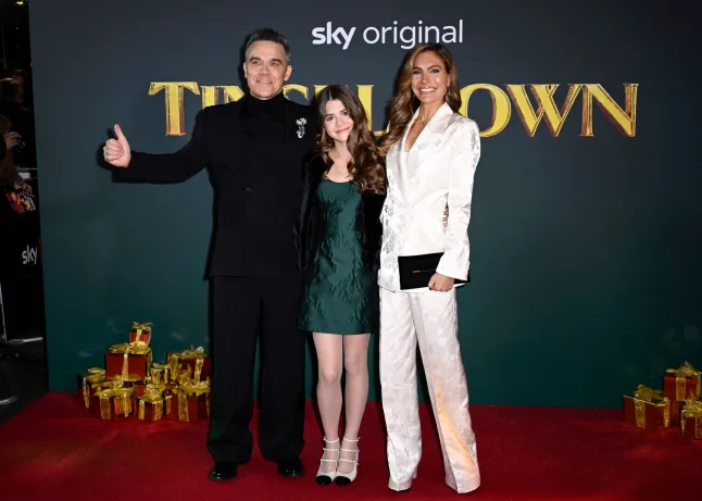 Robbie Williams, Teddy Williams e Ayda Field Williams arrivano per la prima britannica di Tinsel Town, a Vue, Leicester Square a Londra. Data immagine: Giovedì 27 novembre 2025. Foto PA. Il credito fotografico dovrebbe essere: Ian West/PA Wire