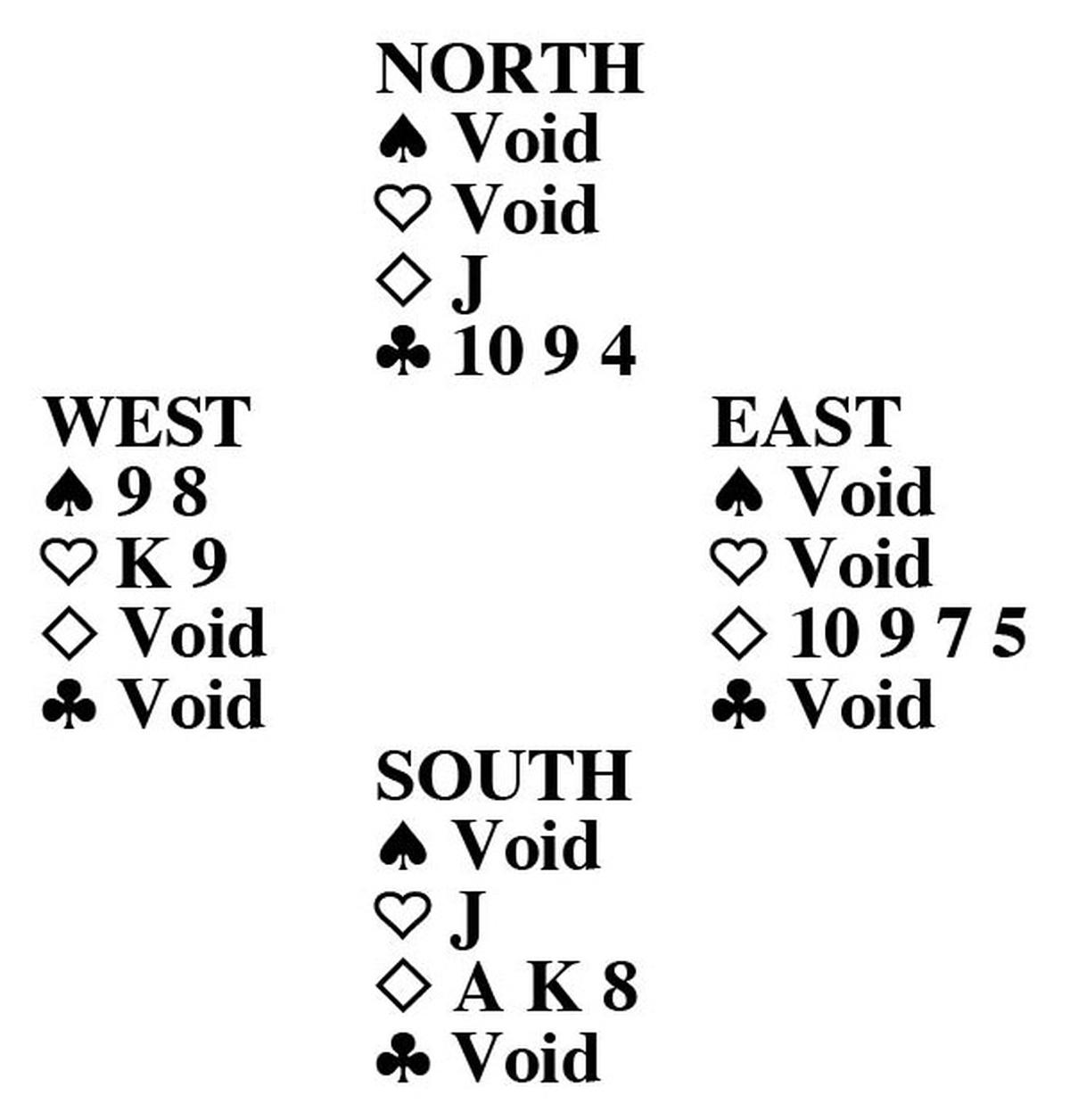 Sud ha vinto il vantaggio iniziale di picche con l’asso del morto e ha guidato il re di fiori. Ovest ha vinto con l’asso e ha puntato un’altra picche al re del morto. South ha incassato la regina di quadri, sentendosi abbastanza bene riguardo alla situazione, e si è sentito male quando West è uscito. Il Sud non si è arreso. Ha incassato la regina di fiori, scartando un cuore dalla sua mano, e ha tagliato un membership. Ha incassato la sua regina di picche, perdendo un cuore basso dal morto, poi ha incassato l’asso di cuori e ha tagliato un cuore. Questa period la posizione, con il comando nel manichino: