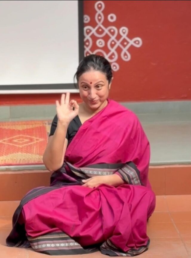 “Cari amici, non sono neanche lontanamente qualificato per interpretare un contadino. È una professione profondamente rispettata e sono onorato di ricoprire questo ruolo,” afferma la narratrice e fondatrice Shilpa Kiranveer, mentre entra nel personaggio per spiegare il significato di Sankranti per gli agricoltori. Per i successivi 15 minuti, diventa Lakshmi, una donna che lavora la terra, contribuisce alla produzione alimentare, gestisce la casa e si prende cura dei suoi figli. Attraverso una narrazione espressiva, Shilpa rende vividamente viva la vita delle donne contadine per il suo giovane pubblico.