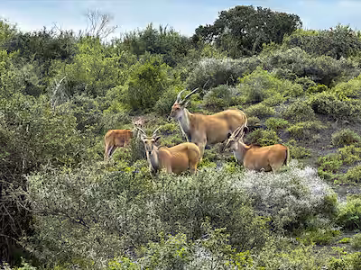 D) L’éland du Cap : Pouvant peser jusqu’à 700 kg, cette antilope, dont le mâle et la femelle sont équipés de cornes, peut se passer d’eau durant des mois.