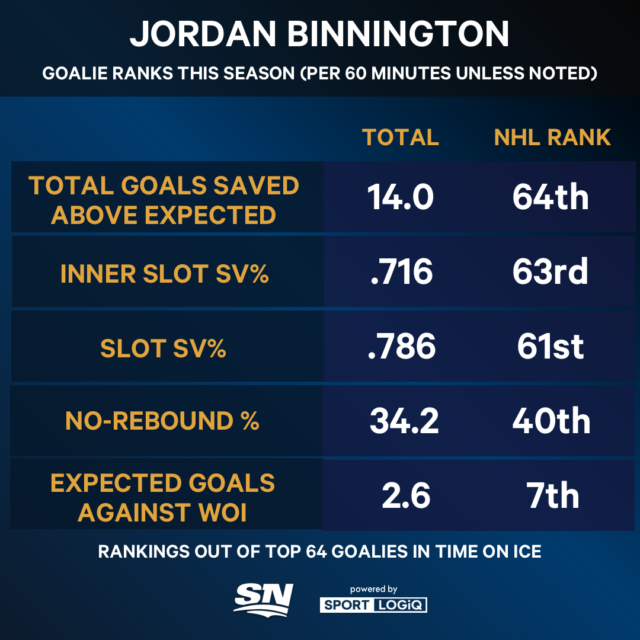 In 33 partite in questa stagione, Binnington ha concesso 14 gol sopra il previsto (0,46 ogni 60 minuti), di gran lunga il maggior numero tra i primi 64 portieri in tempo sul ghiaccio. Il secondo portiere più vicino è Leevi Meriläinen dell’Ottawa, con 9,9 gol subiti sopra le aspettative. Binnington ha parato più gol del previsto in appena 11 delle sue 31 partite da titolare, il che si traduce in un tasso di qualità da titolare del 35,5%.