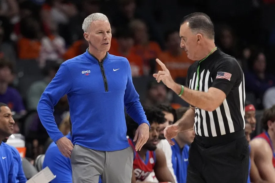 13 marzo 2025; Charlotte, Carolina del Nord, Stati Uniti; Andy Enfield, allenatore dei Southern Methodist Mustangs, durante la prima metà contro i Clemson Tigers allo Spectrum Heart. Credito obbligatorio: immagini di Jim Dedmon-Imagn