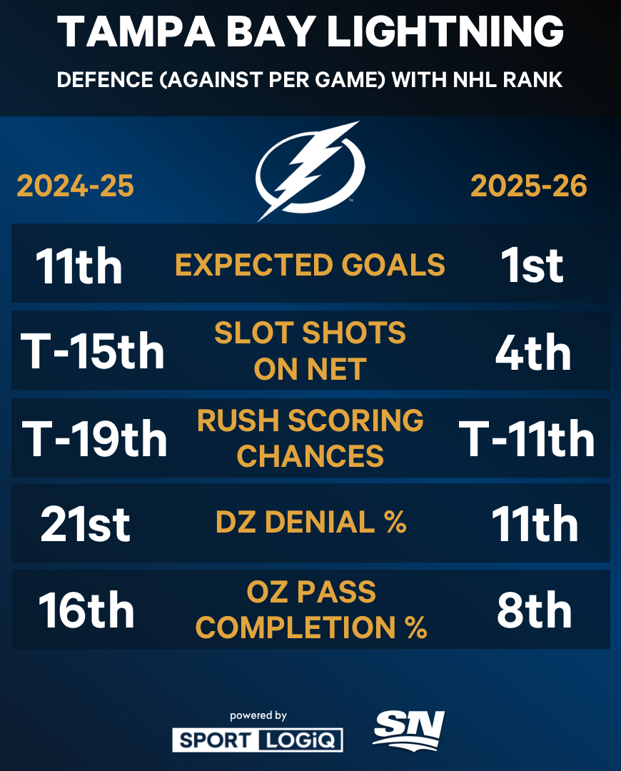 Anche senza Hedman e McDonagh, che insieme hanno giocato più di 2.100 partite di NHL, Tampa Bay è la squadra difensiva numero 1 del campionato in base ai aim attesi (qualità del tiro) subiti per partita. I Lightning hanno ridotto il numero di tiri in rete consentiti dallo slot e hanno rafforzato notevolmente la difesa contro la corsa.