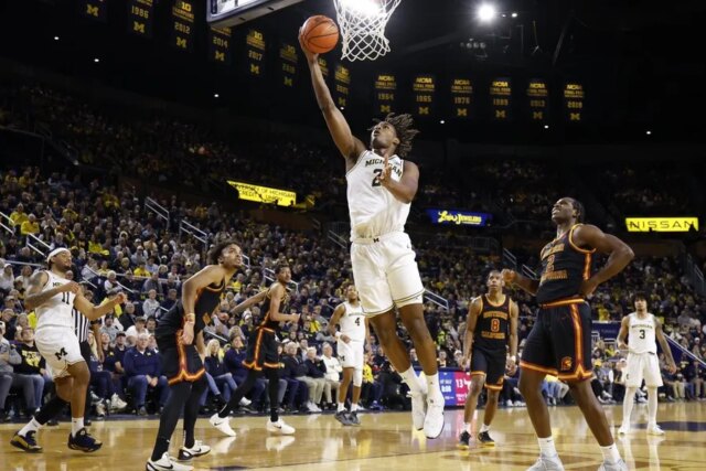 Il Michigan ha tirato solo 6 su 30 da 3 punti durante la notte, ma l’USC non è stata in grado di capitalizzare contro l’avara difesa del Michigan. I Wolverines hanno tenuto i Trojan a soli 20 dei 58 tiri da terra, costringendo l’USC a 21 palle perse.