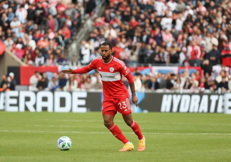 13 aprile 2025; Chicago, Illinois, Stati Uniti; Il centrocampista del Chicago Fireplace FC Kellyn Acosta (23) dribbla il campo durante la seconda metà contro l’Inter Miami CF al Soldier Discipline. Credito obbligatorio: Talia Sprague-Imagn Pictures
