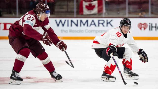 I poco brillanti canadesi, che come l’anno scorso stavano giocando il secondo di un duello consecutivo contro i lettoni riposati nel loro sipario allo showcase annuale, hanno sfondato nel secondo periodo dopo che a Martins Klaucans è stata inflitta una penalità maggiore di cinque minuti e una cattiva condotta di gioco per un controllo illegale alla testa su Zayne Parekh.
