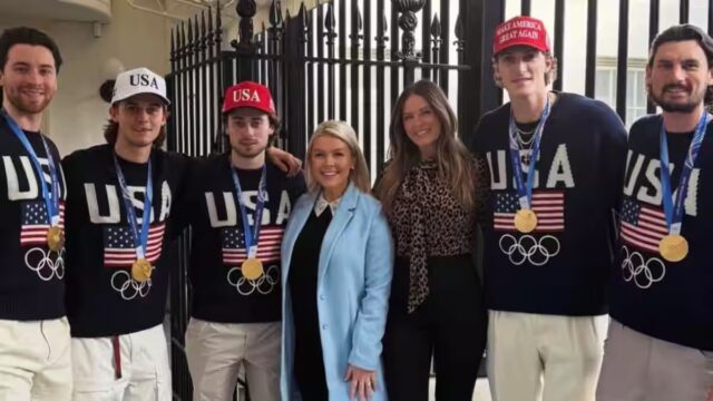 In occasione della visita dei campioni olimpici alla Maison-Blanche, Jeremy Swayman, Jack Hughes, Quinn Hughes, Tage Thompson e Connor Hellebuyck si sono messi in posa con la porta-parole Karoline Leavitt.
