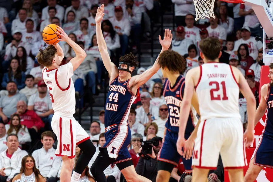 1 febbraio 2026; Lincoln, Nebraska, Stati Uniti; Il Nebraska Cornhuskers Ahead Braden Frager (5) spara la palla contro il centro dell’Illinois Combating Illini Zvonimir Ivisic (44) e la guardia Keaton Wagler (23) durante la seconda metà alla Pinnacle Financial institution Enviornment. Credito obbligatorio: immagini di Dylan Widger-Imagn