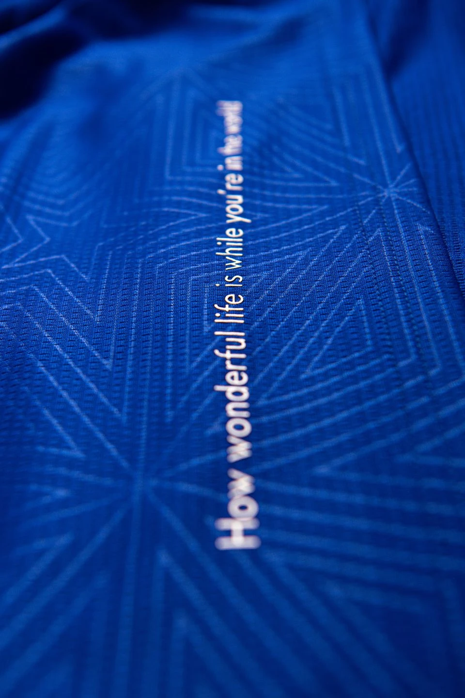 Il colletto e i polsini presentano ulteriori dettagli a forma di stella, mentre sul retro sono impressi i testi di una delle sue canzoni più iconiche, “La tua canzone”.