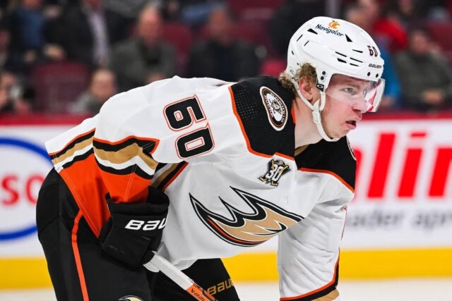 13 febbraio 2024; Montreal, Quebec, CAN; Jackson LaCombe (60), difensore degli Anaheim Geese, attende un faccia a faccia contro i Montreal Canadiens durante il secondo periodo al Bell Heart. Credito obbligatorio: Immagini di David Kirouac-Imagn