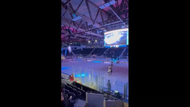 La scena è deviata lors de la finale de la catégorie scolaire M18 D2 du Tournoi nationwide BMO de Rimouski. Les lumières étaient tamisées pour l’entrée des joueurs sur la patinoire qui accueille habituellement l’Océanic.