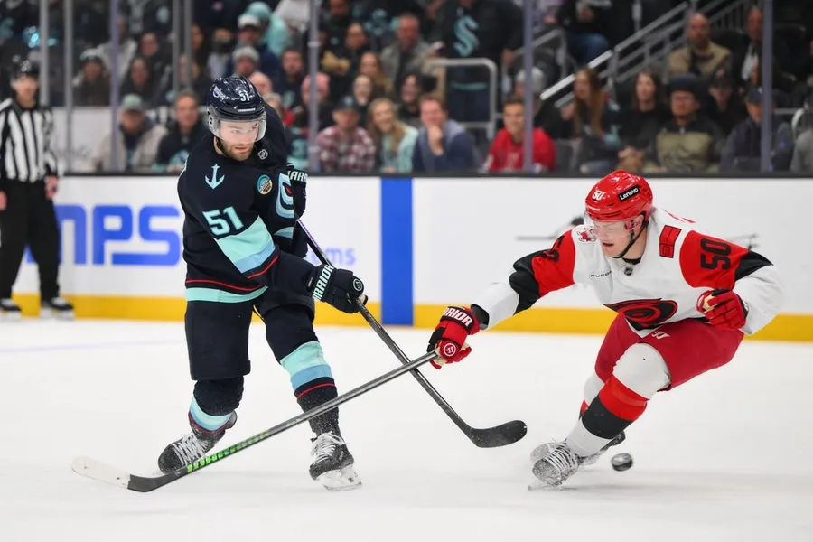 Seattle sembrava essere in vantaggio per 2-0 quando Jaden Schwartz ha intercettato un passaggio di Kakko con un vantaggio maschile al 8:00, ma gli Hurricanes hanno contestato la chiamata e una rapida revisione video ha stabilito che i Kraken erano in fuorigioco quando entravano in zona offensiva.