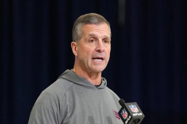 24 febbraio 2026; Indianapolis, IN, Stati Uniti; L’allenatore dei New York Giants John Harbaugh parla alla NFL Scouting Mix presso l’Indiana Conference Middle. Credito obbligatorio: Immagini di Kirby Lee-Imagn
