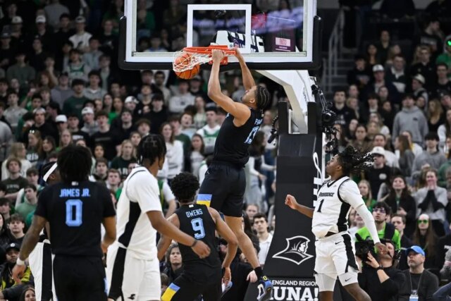 4 marzo 2026; Windfall, Rhode Island, Stati Uniti; Marquette Golden Eagles Ahead Royce Parham (13) pende dal bordo dopo aver schiacciato la palla contro i Windfall Friars durante la prima metà all’Amica Mutual Pavilion. Credito obbligatorio: Immagini Eric Canha-Imagn