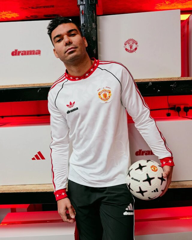 Questa versione aggiornata arriva in una base bianca a maniche lunghe con tre strisce rosse, il trifoglio adidas e lo stemma del membership, mentre Drama Name applica la propria svolta attraverso un brand a stella stilizzato. È presente sulla manica al posto dello stemma della competizione, sui colletti e sui polsini e come un leggero motivo oversize sul davanti.