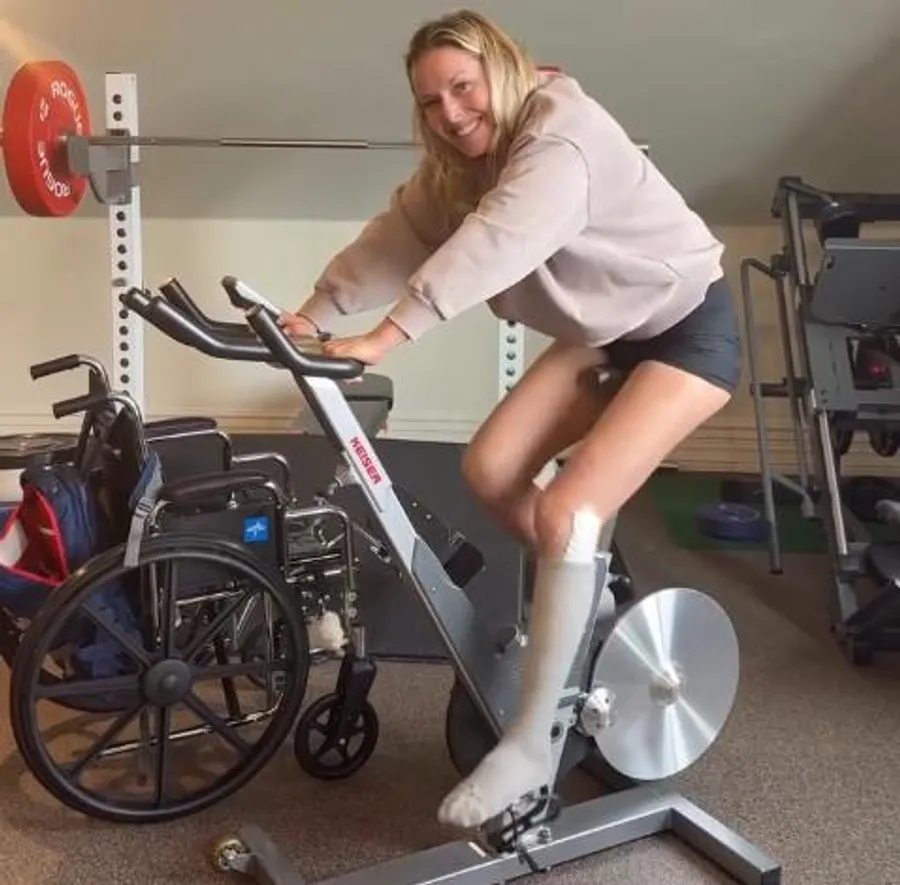 Cinque settimane dopo l’incidente olimpico che le ha quasi portato all’amputazione della gamba sinistra, la riabilitazione di Lindsey Vonn è passata all’utilizzo di una cyclette.