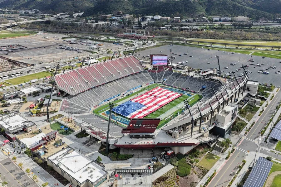 2 gennaio 2026; San Diego, California, Stati Uniti; Una veduta aerea generale di una bandiera degli Stati Uniti sul campo allo Snapdragon Stadium durante l’Vacation Bowl tra gli Arizona Wildcats allo SMU Mustangs. Credito obbligatorio: Immagini di Kirby Lee-Imagn