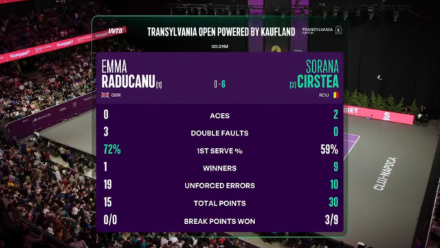 Ma le sue speranze sono state infrante nella sconfitta per 6-0 6-2 a Cluj-Napoca, dove il tifo è stato equamente diviso tra la favorita di casa Cirstea e Raducanu, il cui padre è rumeno.