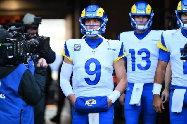 25 gennaio 2026; Seattle, WA, Stati Uniti; Matthew Stafford (9), quarterback dei Los Angeles Rams, cammina sul campo prima della partita del campionato NFC 2026 contro i Seattle Seahawks al Lumen Area. Credito obbligatorio: Immagini Steven Bisig-Imagn