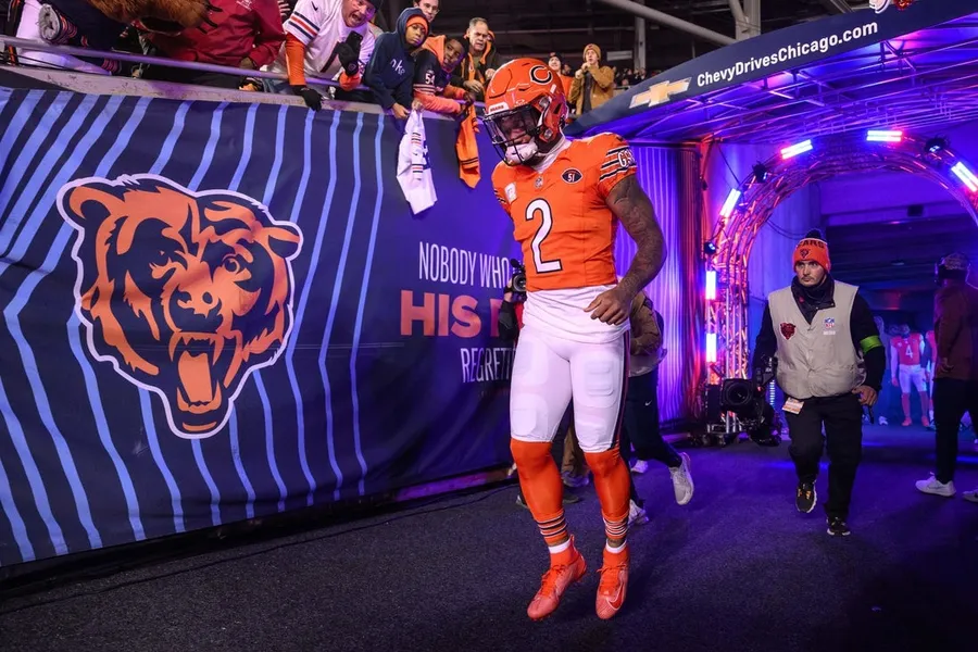 9 novembre 2023; Chicago, Illinois, Stati Uniti; Il ricevitore largo dei Chicago Bears DJ Moore (2) entra in campo prima di una partita contro i Carolina Panthers al Soldier Area. Credito obbligatorio: Immagini Daniel Bartel-Imagn