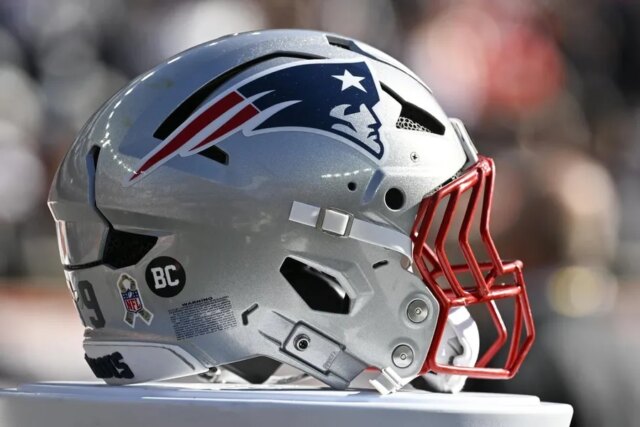 2 novembre 2025; Foxborough, Massachusetts, Stati Uniti; Vista in dettaglio di un casco dei New England Patriots prima della partita contro gli Atlanta Falcons al Gillette Stadium. Credito obbligatorio: Immagini Eric Canha-Imagn