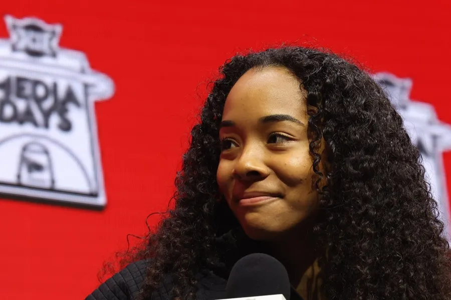 21 ottobre 2025; Kansas Metropolis, Missouri, Stati Uniti; Lani White dello Utah parla ai media durante il Massive 12 Girls’s Basketball Media Day al T-Cellular Heart. Credito obbligatorio: Immagini Sophia Scheller-Imagn