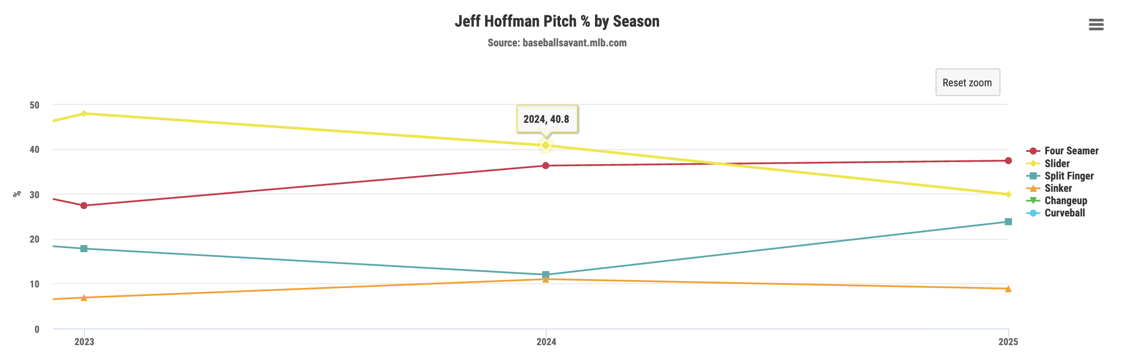 Come parte della sua riunione di ingresso primaverile, lui e i Blue Jays hanno discusso del suo utilizzo del campo e dei modi per adattarsi. Nelle ultime tre stagioni, le sue percentuali di palla veloce e splitter sono aumentate a scapito del suo slider, che è passato dal 47,9% nel 2023, al 40,8% nel 2024 al 29,9% lo scorso anno. L’thought ora è quella di ridurre l’uso del riscaldatore per fondere in modo più efficace le altre due offerte.