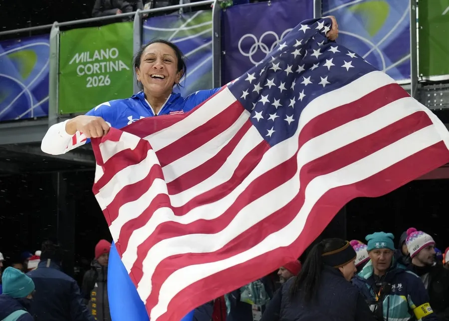 16 febbraio 2026; Cortina d’Ampezzo, Italia; Elana Meyers Taylor degli Stati Uniti festeggia dopo aver vinto la gara di bob monobob femminile durante i Giochi Olimpici Invernali di Milano Cortina 2026 al Cortina Sliding Middle. Credito obbligatorio: Immagini Michael Madrid-Imagn