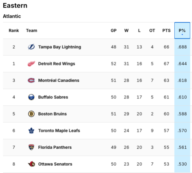 L’ordinamento in base alla percentuale di punti (piuttosto che ai punti) ha evidenziato che Tampa è in una posizione migliore rispetto a Detroit, ma per il resto l’ordine del resto è rimasto lo stesso.