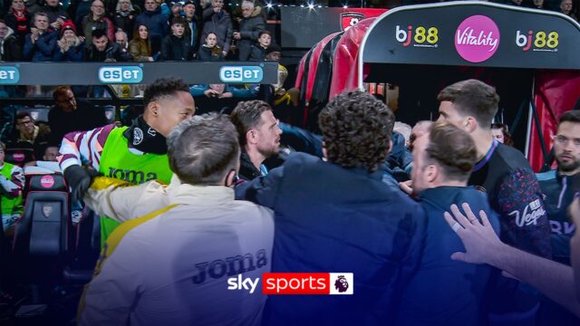 Jordan Henderson del Brentford sembra offendersi con la panchina del Bournemouth dopo il pareggio per 0-0 al Vitality Stadium, anche se entrambi gli allenatori minimizzano dopo la partita.