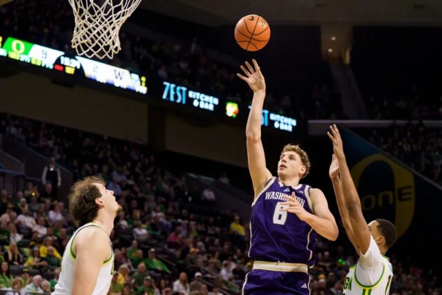 L’attaccante di Washington Hannes Steinbach, al centro, si prepara a una ripresa mentre gli Oregon Geese ospitano i Washington Huskies il 7 marzo 2026, alla Matthew Knight Enviornment di Eugene, Oregon.