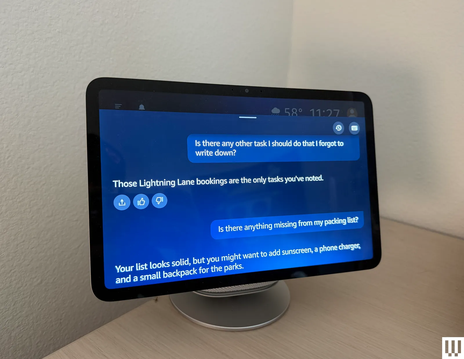Almeno è stato un solido inizio di conversazione e ha dato advert Alexa una buona base per ciò di cui volevo parlare e gestire. Ho anche potuto chiedere se pensava che mi mancasse qualcosa dalla mia lista dei bagagli che fosse esclusivamente vestiti e scarpe, e l’assistente mi ha segnalato che avrei dovuto mettere in valigia una crema solare, un caricabatterie e un piccolo zaino. È corretto, ma la cosa vera che mi serve che mi ricordi di portare è il dentifricio. Ma non sono sicuro che Alexa possa salvarmi dal dimenticare cronicamente di portare il dentifricio.