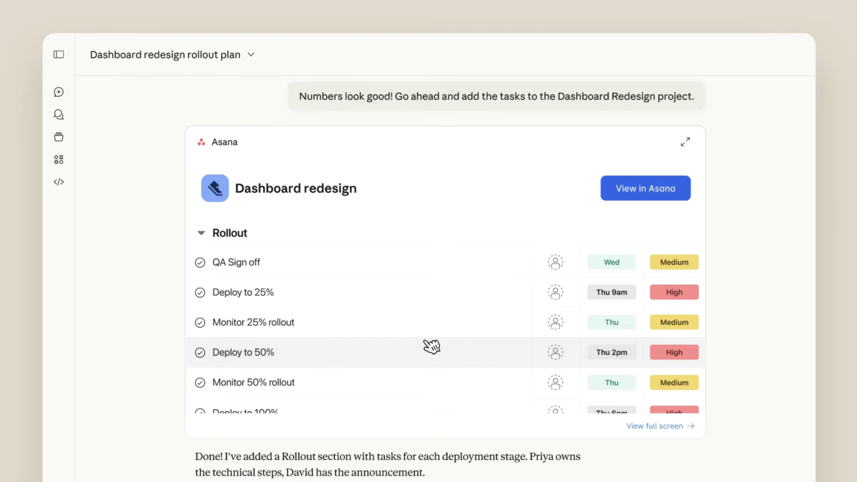 Advert esempio, con Slack, puoi fare in modo che Claude rediga i messaggi utilizzando il contesto derivato dai messaggi precedenti nella tua casella di posta, rivedendoli e riformattandoli a tuo piacimento prima di premere Invia. Canva consente la creazione di schemi di presentazione e lavoro di progettazione in tempo reale, mentre Asana trasformerà le tue chat con Claude in progetti che il resto del tuo staff potrà vedere ed eseguire.