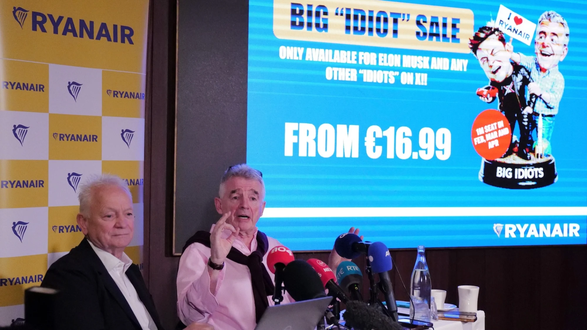 Martedì, Ryanair ha spostato le cose in un territorio ancora più immaturo di Musk (difficile da fare), con un put up su X in cui annunciava che O’Leary avrebbe convocato una conferenza stampa mercoledì alle 10 a Dublino, suggerendo che la compagnia aerea sta “lanciando una vendita di posti Nice Idiots appositamente per Elon e tutti gli altri idioti su ‘X’.” E sì, O’Leary ha tenuto la conferenza, con Ryanair sta effettivamente lanciando quella vendita.