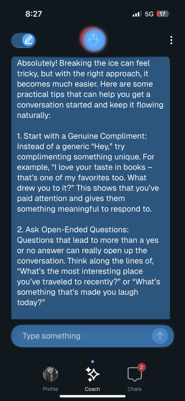 Gli ho chiesto di darmi consigli su come rompere il ghiaccio con nuovi abbinamenti, e lui mi ha dato consigli, con ogni punto che aveva un paragrafo esplicativo sotto. I consigli includevano fare complimenti, porre domande aperte, usare l’umorismo, fare riferimento a eventi attuali, condividere informazioni su se stessi e menzionare interessi comuni. Il consiglio period semplice ma solido e rispecchiava ciò che l’allenatore stava facendo con le istruzioni di conversazione fornite.