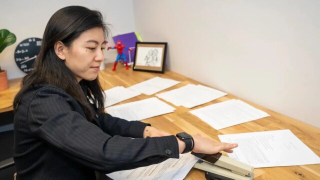 Violet Han utilizza una cucitrice fissata a una piattaforma controllata da modelli IA.