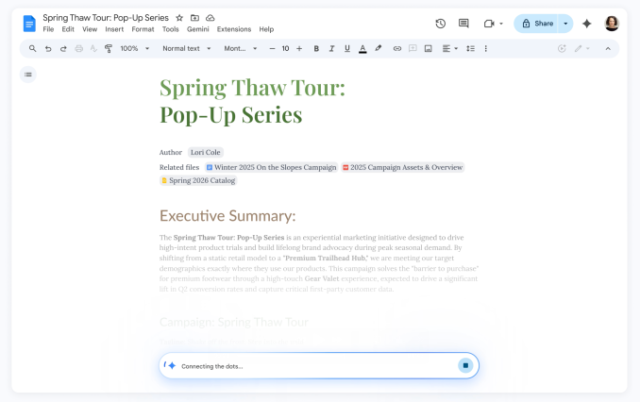 Google annunciato martedì che porterà una serie di nuove funzionalità di intelligenza artificiale basate su Gemini a Documenti, Fogli, Presentazioni e Drive. Le nuove funzionalità consentono agli utenti di eseguire operazioni come generare rapidamente prime bozze, diapositive e fogli completamente formattati in base alle informazioni provenienti da Gmail, Chat e Drive.