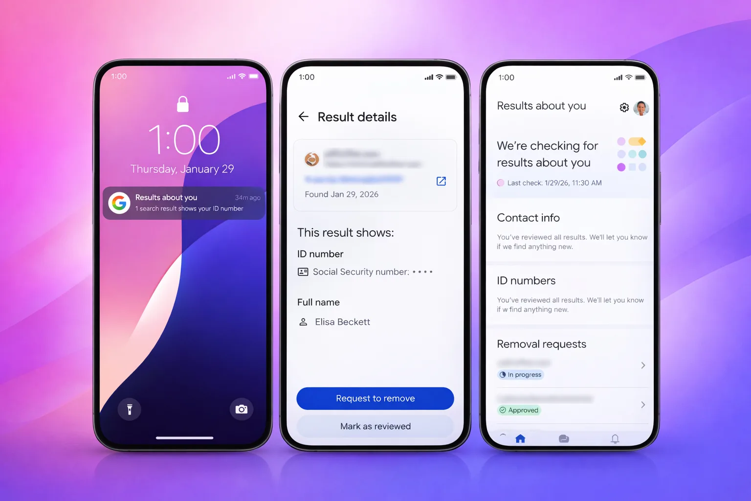 Ora puoi tenere traccia di tutte le tue richieste di rimozione in un unico posto tramite l’hub Risultati su di te, con aggiornamenti by way of e mail per tenerti informato ogni volta che lo stato cambia.