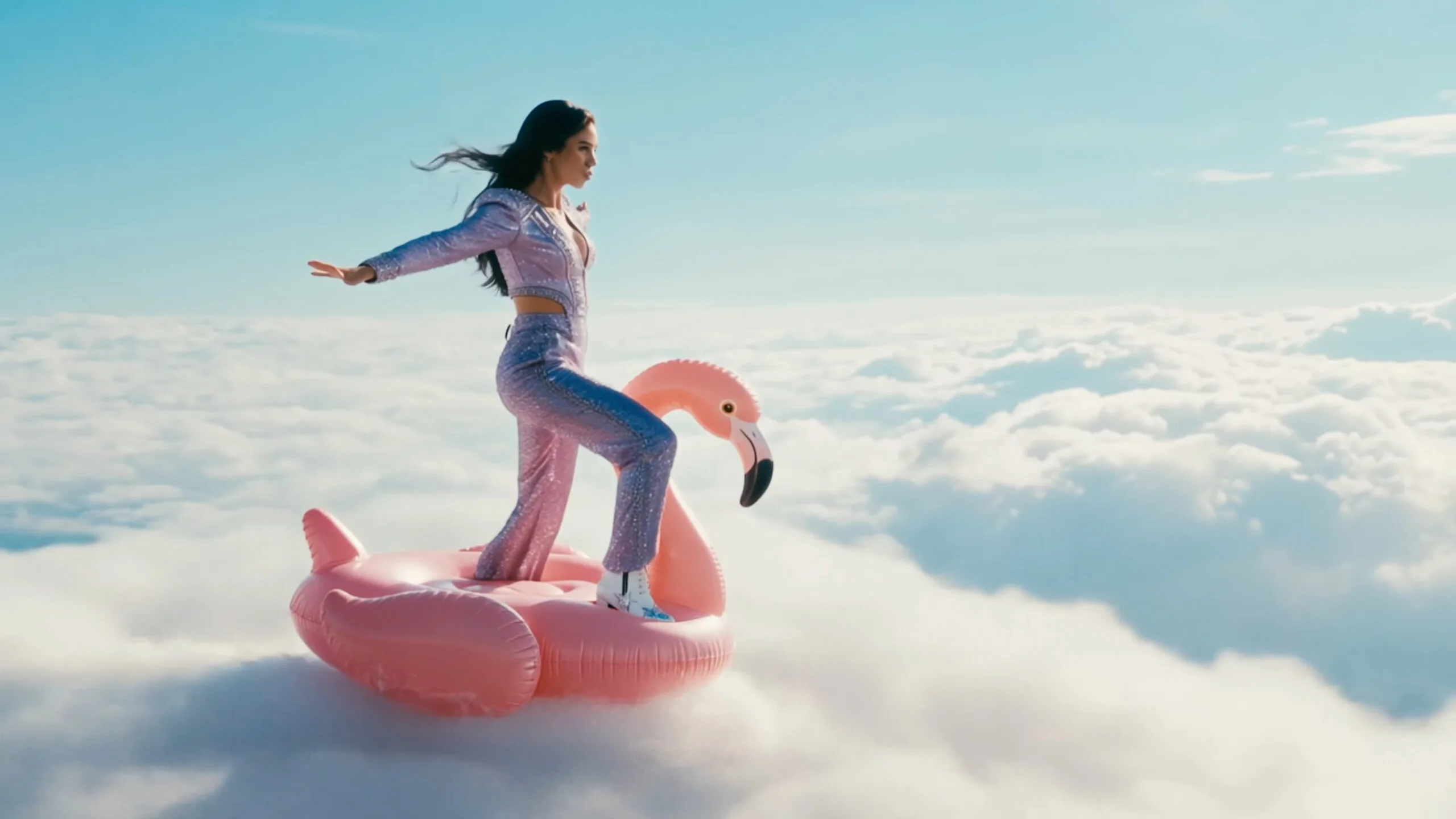 Le immagini in “Take the Lead” sono volutamente caotiche. Ci sono fenicotteri che fluttuano tra le nuvole, delfini che volano in aria e Norwood che si esibisce in stadi gremiti. Ma il messaggio della canzone è assolutamente serio. Il suo punto centrale sostiene che l’intelligenza artificiale non è il nemico e inquadra la tecnologia come un superpotere per i creatori umani.