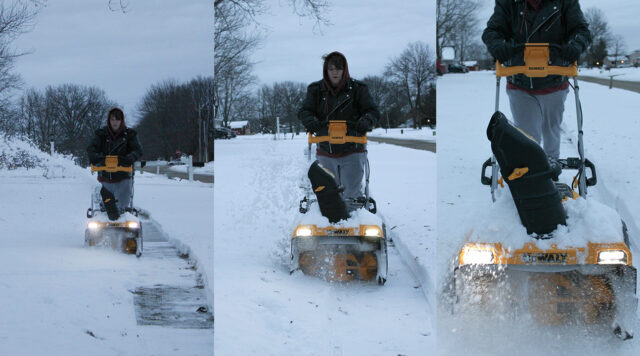 E poiché avevo così tanta potenza in più, ho fatto quello che avrebbe fatto qualsiasi altro abitante del Midwest: ho ripulito quanti più marciapiedi e vialetti dei miei vicini potevo. Sono riuscito a ripulire l’intero marciapiede sul nostro lato della strada, nonché due dei tre vialetti, prima di dover tornare a casa mia per ricaricare le batterie.