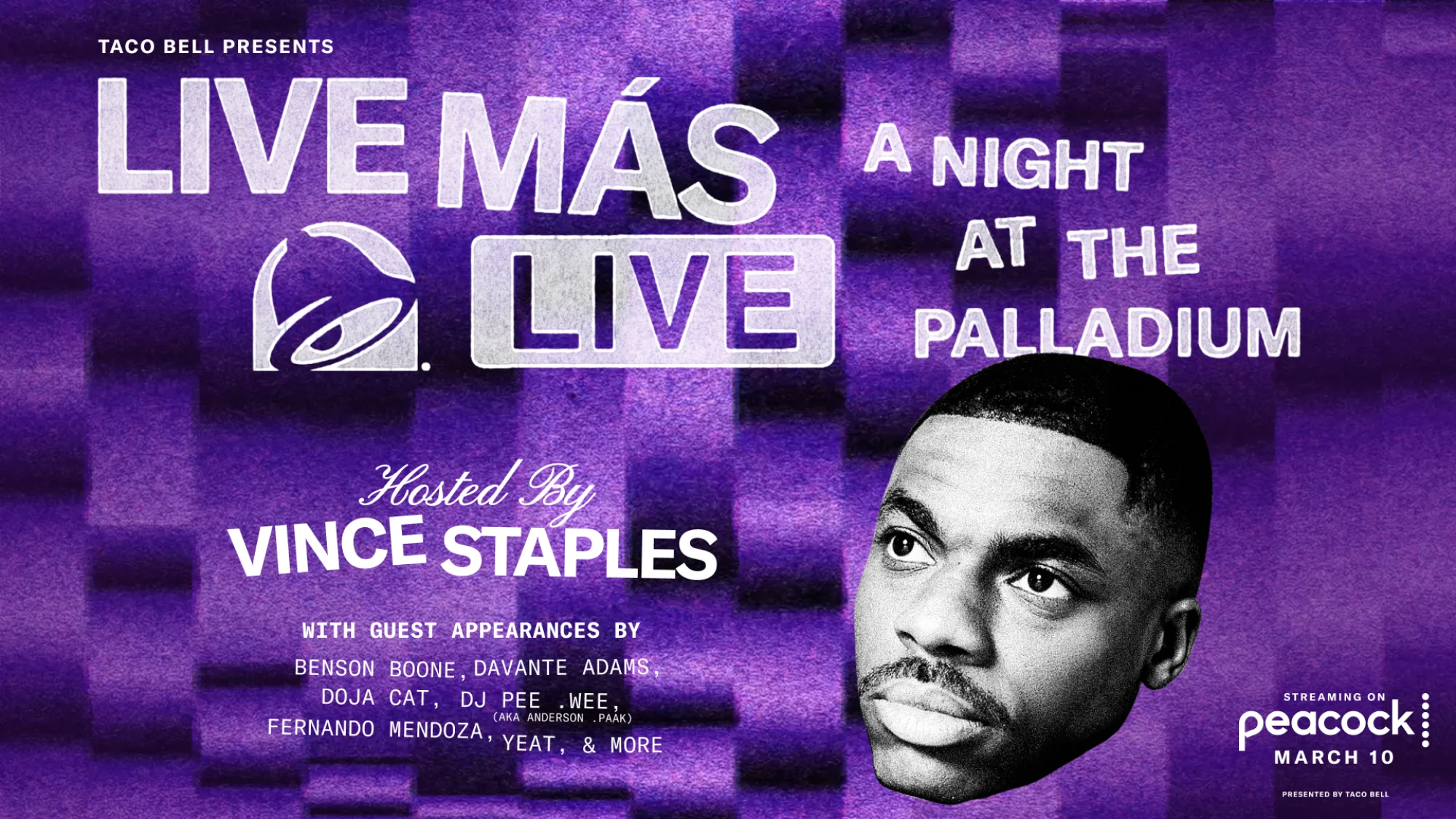 Registrato in diretta dall’Hollywood Palladium, Dwell Más Dwell ritorna per il suo terzo anno di imbrogli. È essenzialmente uno spettacolo di varietà ispirato a Hollywood con apparizioni di ospiti, musica originale, pezzi comici, momenti dei fan e altro ancora per rivelare le innovazioni del menu Taco Bell per l’anno. Vince Staples ospiterà lo speciale di una notte il 10 marzo e gli ospiti speciali includeranno Ariana Madix, Benson Boone, Doja Cat, Fernando Mendoza e altri.
